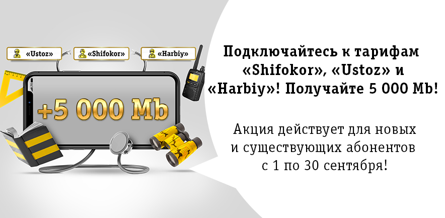 В честь праздника 1 Сентября Beeline Business предоставляет дополнительный интернет-пакет в 5 000 MB на 30 дней абонентам тарифных линеек Shifikor, Ustoz, Shifokor Start/Profi, Ustoz Start/Profi и Harbiy Start/Profi.