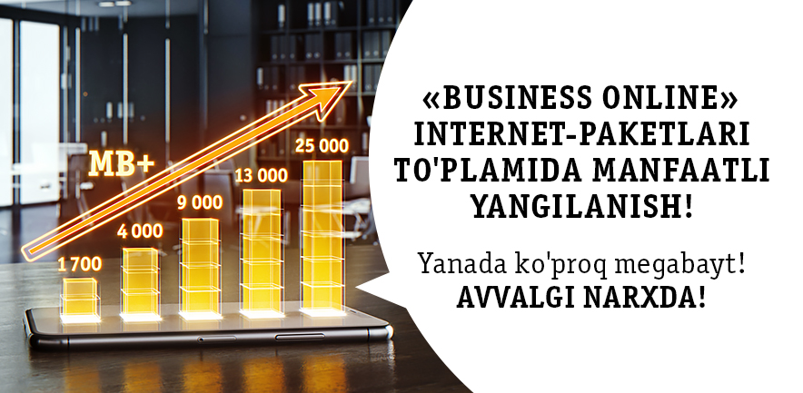 Sizga "Business Online" Internet-paketlari turkumining yangilanishi to'g'risida xabar berishdan mamnunmiz: 1 fevraldan postpeyd to'lov tizimining abonentlari uchun va 5 fevraldan oldindan to'lov tizimining abonentlari uchun!